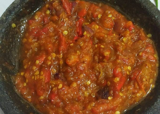 - Goreng hingga layu cabe²an, bamer, dan tomat. Lalu ulek, masukkan terasi, gula, garam dan penyedap rasa..
