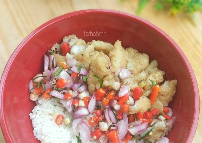- Siapkan nasi dalam mangkok, letakan potongan dori diatasnya. Siram dengan sambal matah. Siap disajikan..